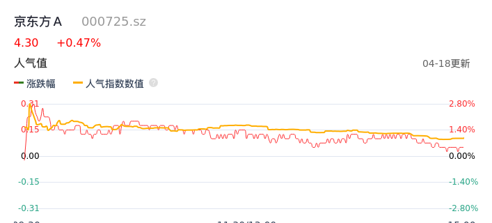 04月18日,京东方A收报4.30,股价涨幅0.47%,成交金额19.32亿元,换手率1.21%。