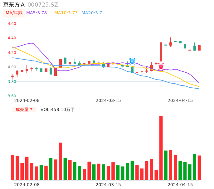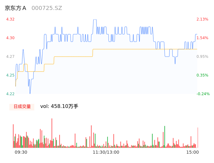 04月15日,京东方A收报4.30,股价涨幅1.65%,成交金额19.62亿元,换手率1.24%。