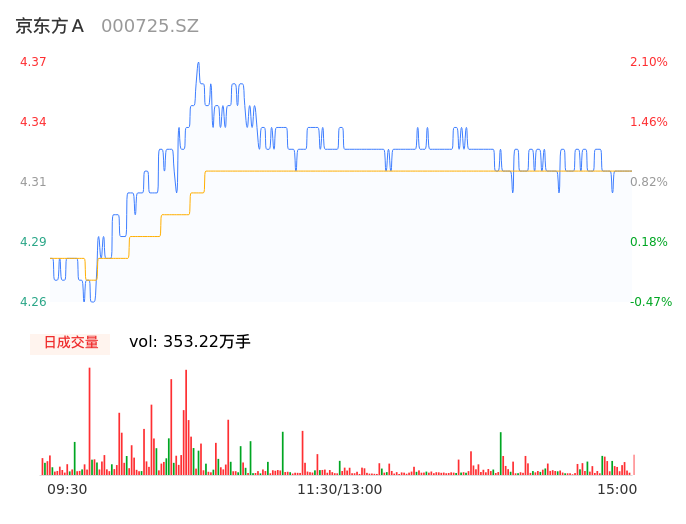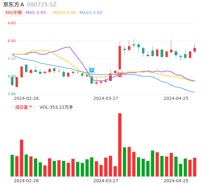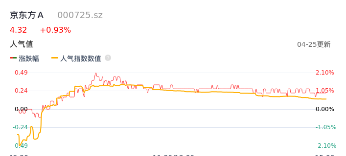 04月25日,京东方A收报4.32,股价涨幅0.93%,成交金额15.27亿元,换手率0.96%。