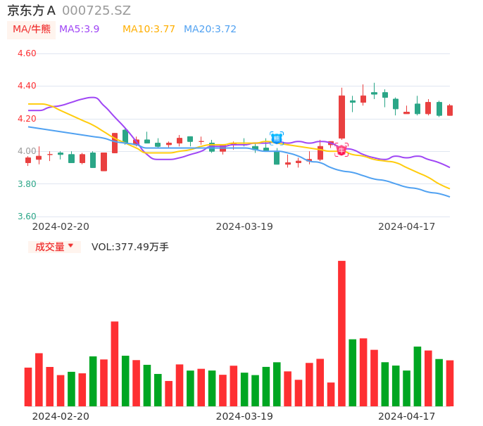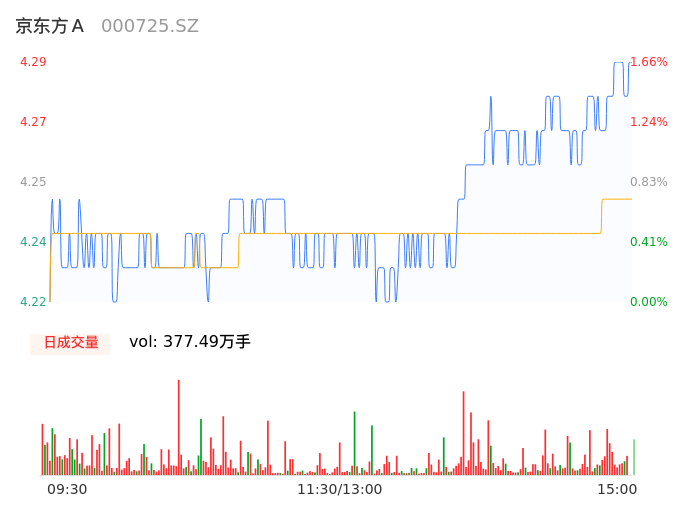 04月17日,京东方A收报4.28,股价涨幅1.42%,成交金额16.03亿元,换手率1.02%。