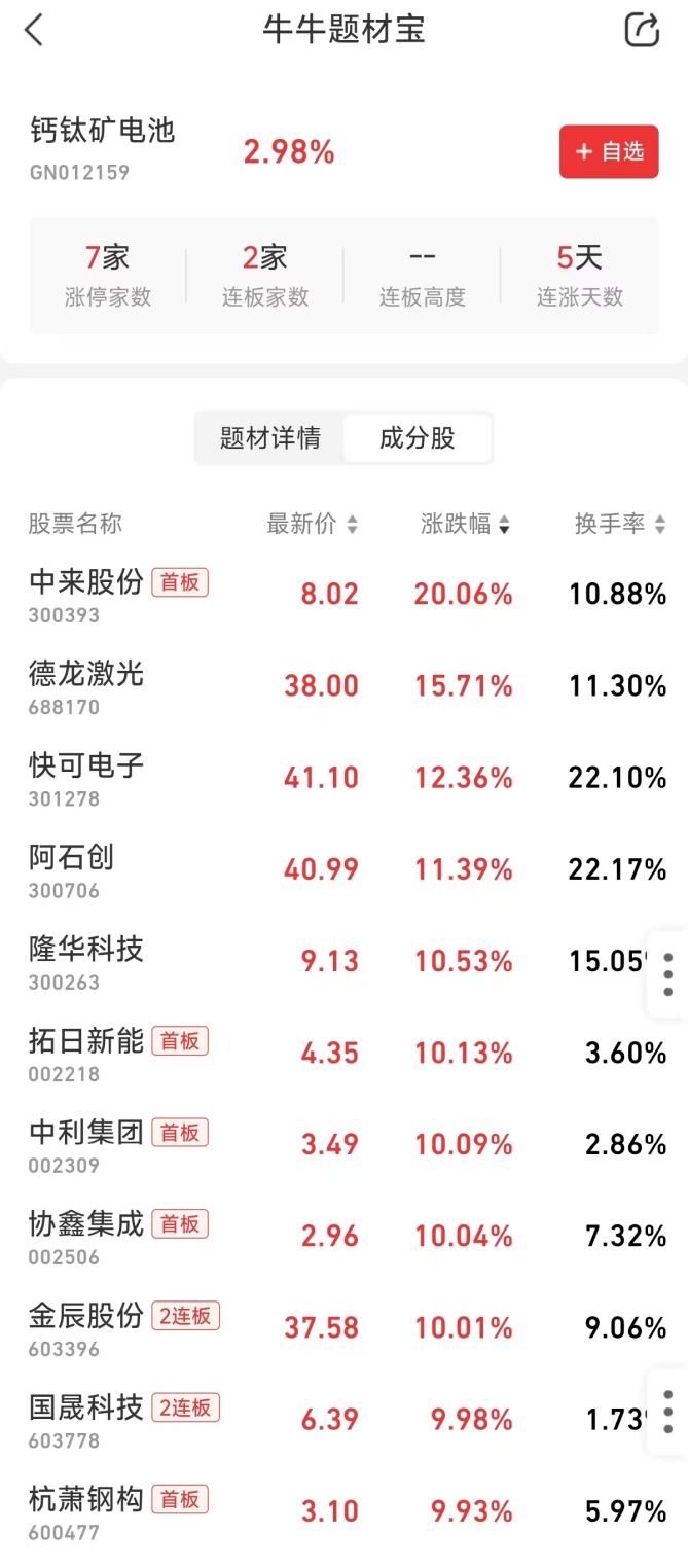 11月11日,钙钛矿板块上演涨停潮,板块指数高开高走,连续第5日上涨,创2年半来新高。中来股份开盘仅约9分钟20%涨停,拓日新能仅1分钟垂直封板,中利集团也仅2分钟直线涨停,协鑫集成、金辰股份等亦快速涨停。