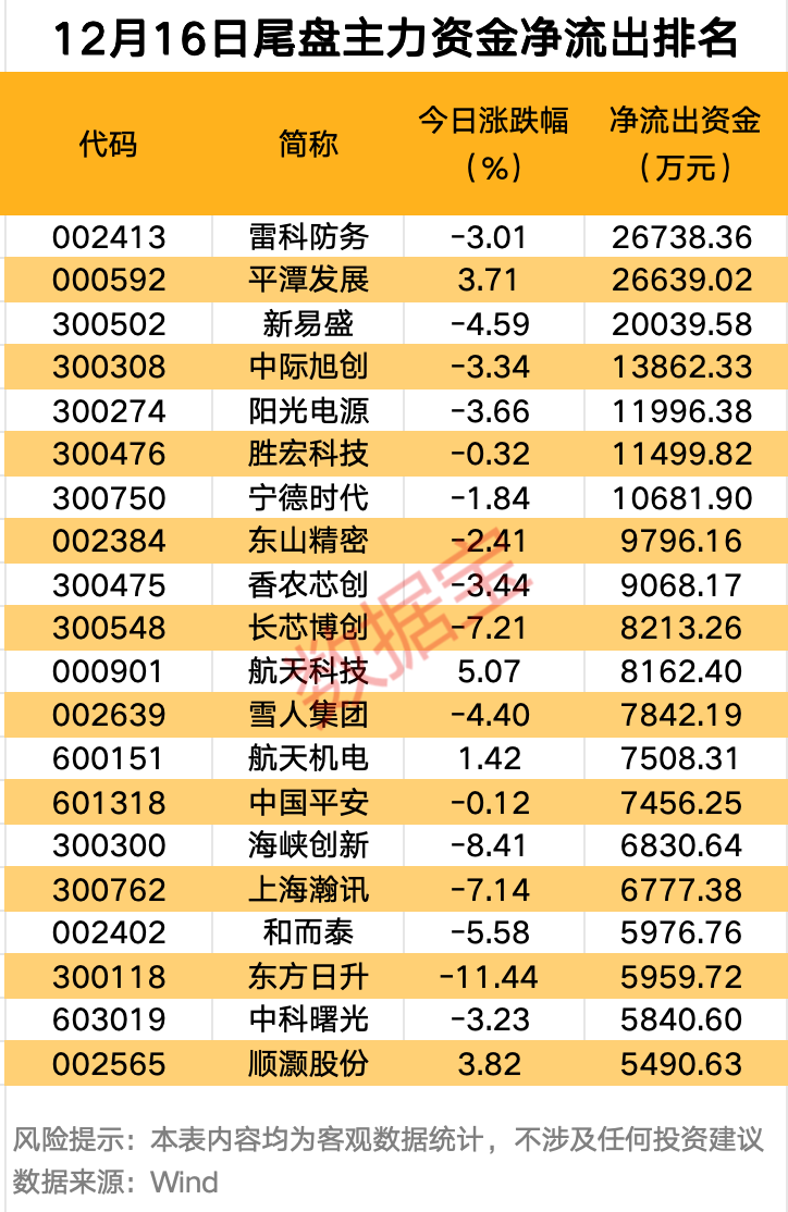 尾盘主力资金净流出方面,雷科防务、平潭发展、新易盛尾盘主力资金净流出超2亿元;中际旭创、阳光电源、胜宏科技、宁德时代尾盘主力资金净流出均超1亿元。