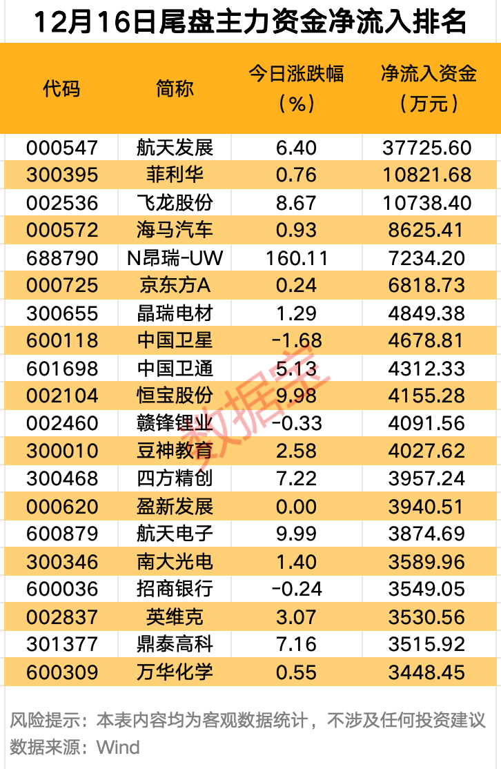 个股方面,航天发展、菲利华、飞龙股份尾盘主力资金净流入超1亿元。海马汽车、N昂瑞-UW、京东方A、晶瑞电材、中国卫星等个股尾盘也获主力资金净流入超4000万元。