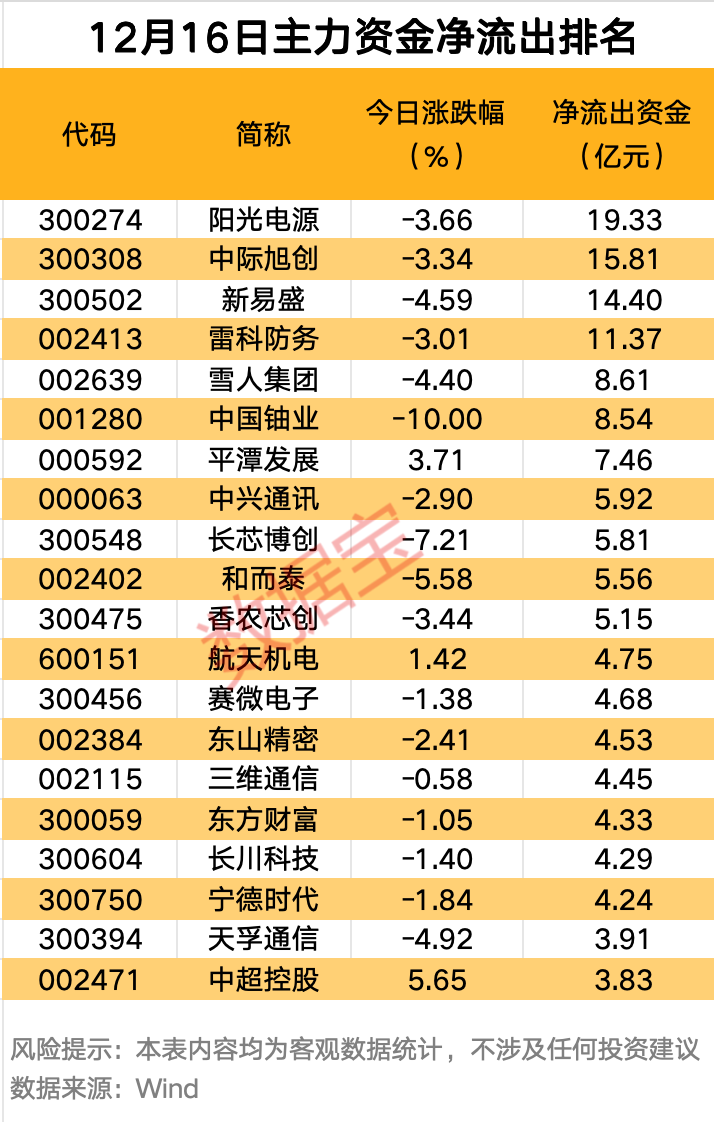 今日有33股主力资金净流出超3亿元,其中,阳光电源、中际旭创、新易盛、雷科防务、雪人集团、中国铀业等热门股净流出金额均超8亿元。