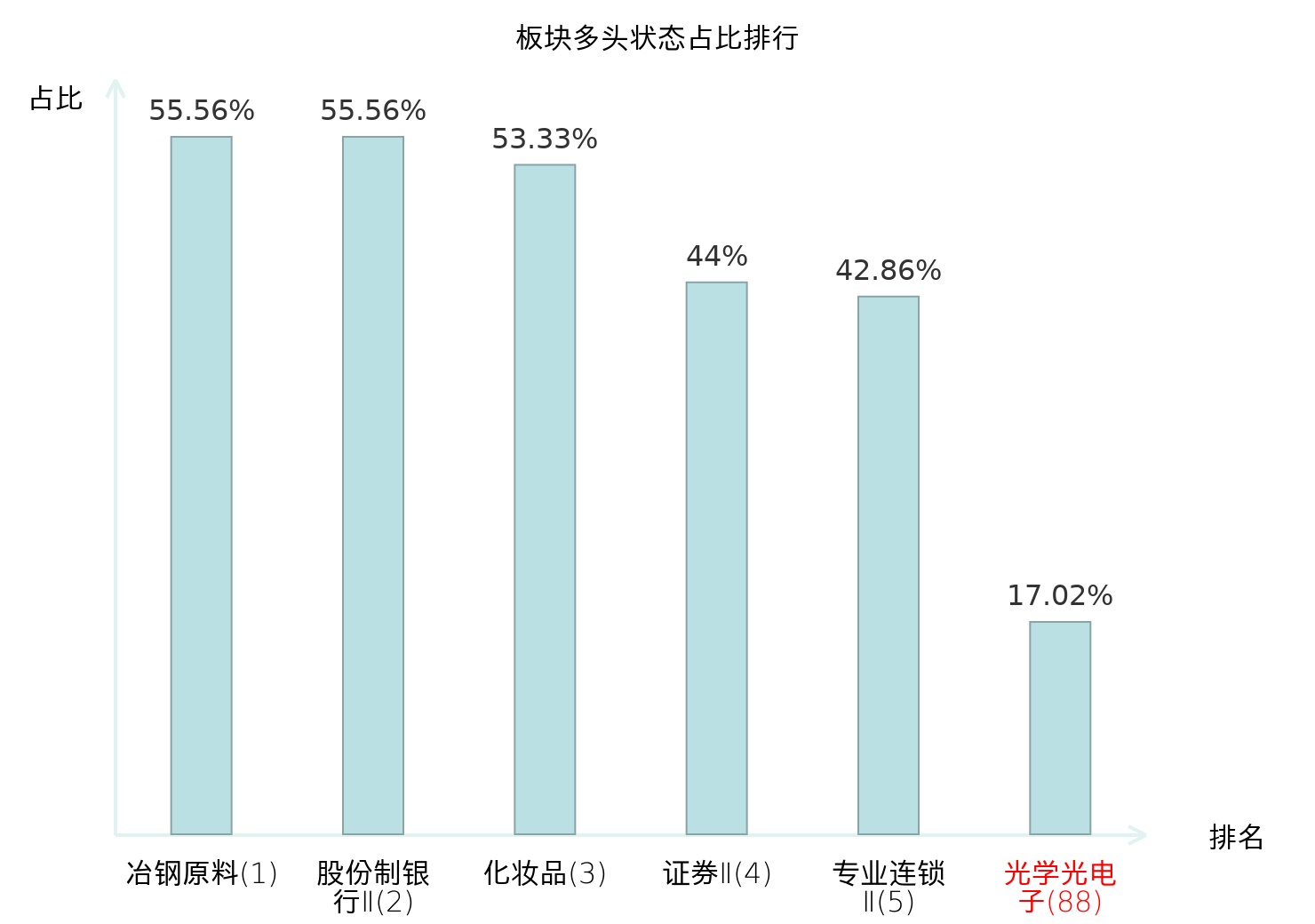 全市场所有行业板块中主力多头状态占比排名中,冶钢原料板块位居第一。保险Ⅱ板块名次提升最快,较昨日上升114位。
