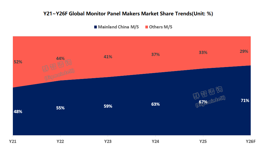 2025年全球显示器面板市场竞争格局迎来历史性重构,LGD策略性收缩LCD业务,台系厂商受成本与产能冲击逐步转向细分市场,中国大陆面板厂商凭借产能规模、技术突破与成本优势,市场份额大幅提升至67%,正式确立全球市场主导地位。2026年,供应链重构趋势将进一步深化,中国大陆厂商将迎来更多结构性增长机会,整体市场份额有望突破70%,全面主导全球显示器面板市场供应。