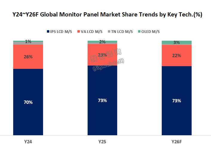 LCD 作为显示器面板的核心品类,2025年出货量仍占据市场98%份额,但内部品类表现迥异。IPS 面板凭借技术优势契合消费与商用市场需求,渗透率进一步扩大至 73%,成为市场主流选择;VA 面板则受双重挤压,高端市场被 OLED 抢占,中低端市场竞争力弱于IPS,市场份额持续萎缩。2026年,受 LGD 产能供应收缩影响,IPS 面板产能供应将受限,预计渗透率将维持在 73% 左右。