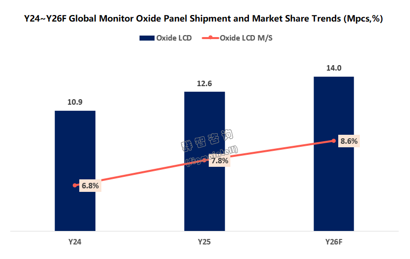 氧化物技术是LCD 面板高端化的重要发展方向,群智咨询(Sigmaintell)数据显示,2025年全球显示器 Oxide 面板出货量约 1260 万片,市场渗透率约 7.8%。目前全球 Oxide 面板产能储备丰富,但受市场需求与产能分配影响,整体稼动率仅 60% 左右,出货规模尚未充分释放,未来增长潜力较大。2026 年,随着市场需求的逐步提升,Oxide面板市场渗透率有望进一步增长至 8.6%。