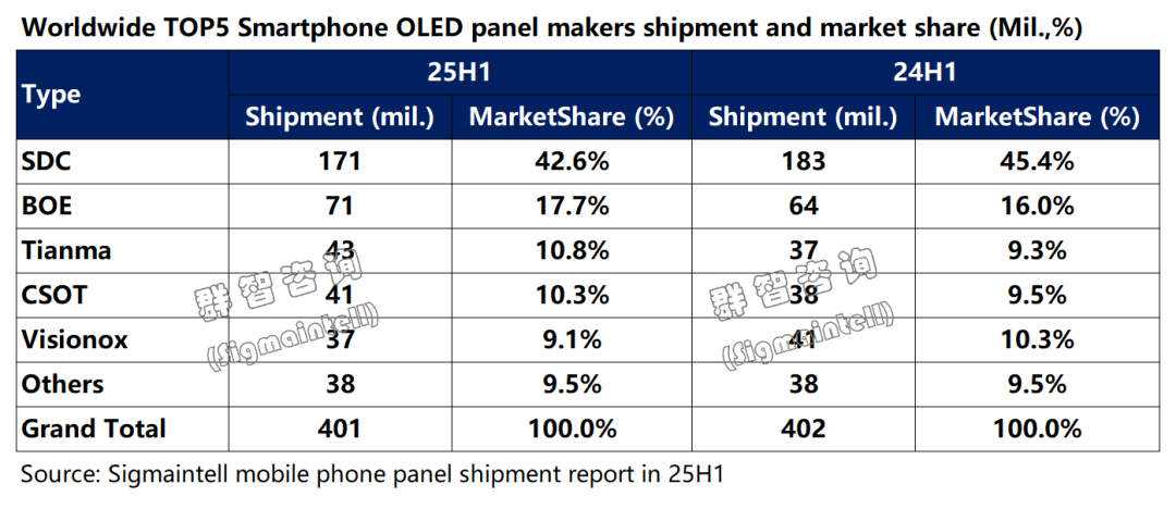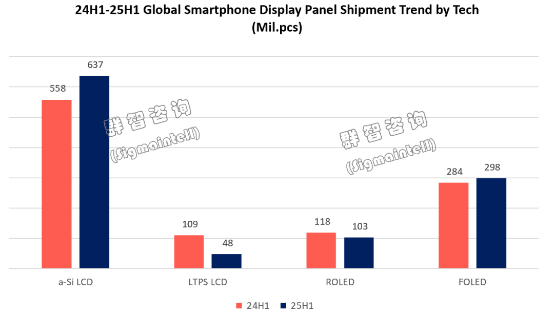 群智咨询(Sigmaintell)数据显示,2025年上半年全球OLED智能手机面板出货超过4亿片,同比持平;其中柔性OLED出货约3亿片,同比增长约5.2%。
