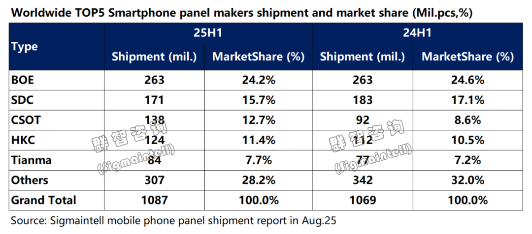 2025年上半年全球智能手机面板出货量前三名:京东方(BOE)为首,三星显示(SDC)位居第二,华星光电(CSOT)出货量第三。