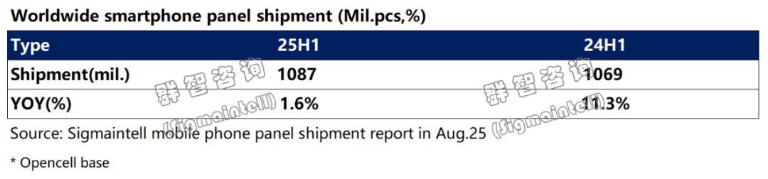 智通财经APP获悉,根据群智咨询(Sigmaintell)全球智能手机面板出货追踪数据,2025年上半年出货量约10.9亿片(Open Cell口径),同比增长1.6%。上半年,智能手机面板市场呈现“政策驱动型增长”与“技术分化”并存的特征,整体出货呈现温和增长趋势。