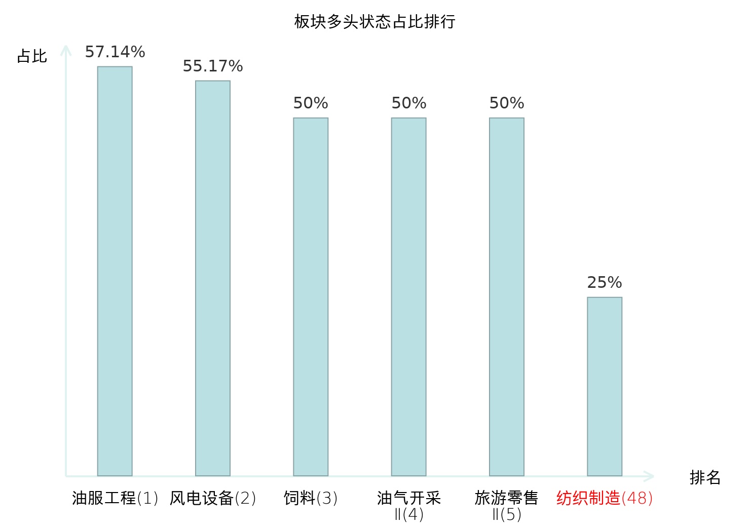 全市场所有行业板块中主力多头状态占比排名中,油服工程板块位居第一。非金属材料Ⅱ板块名次提升最快,较昨日上升67位。