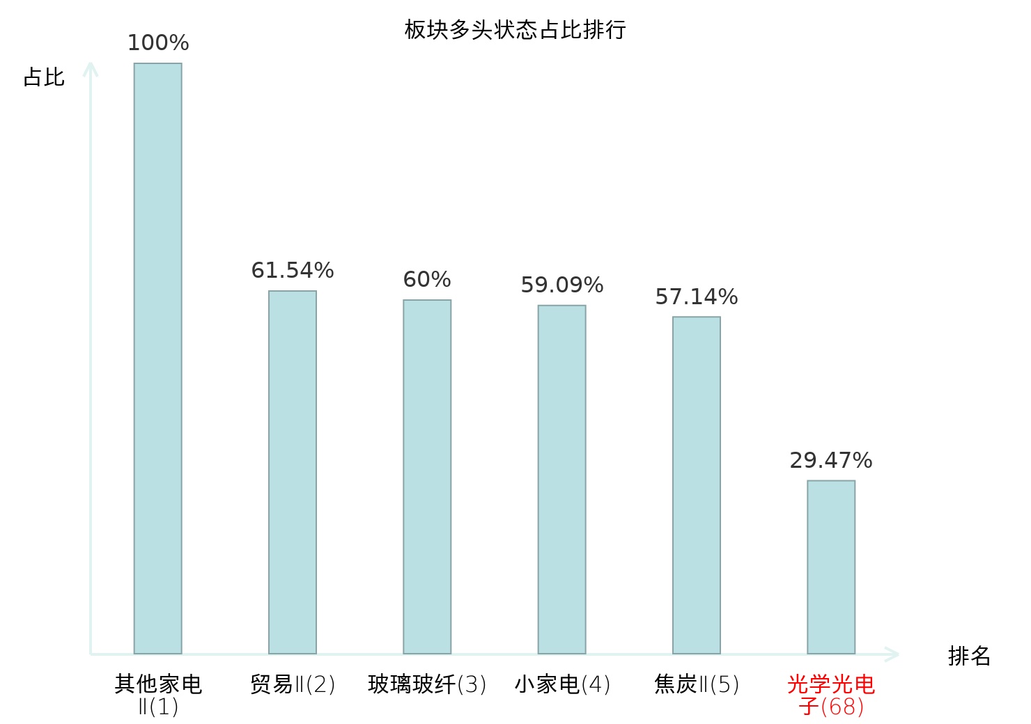全市场所有行业板块中主力多头状态占比排名中,其他家电Ⅱ板块位居第一。摩托车及其他板块名次提升最快,较昨日上升76位。