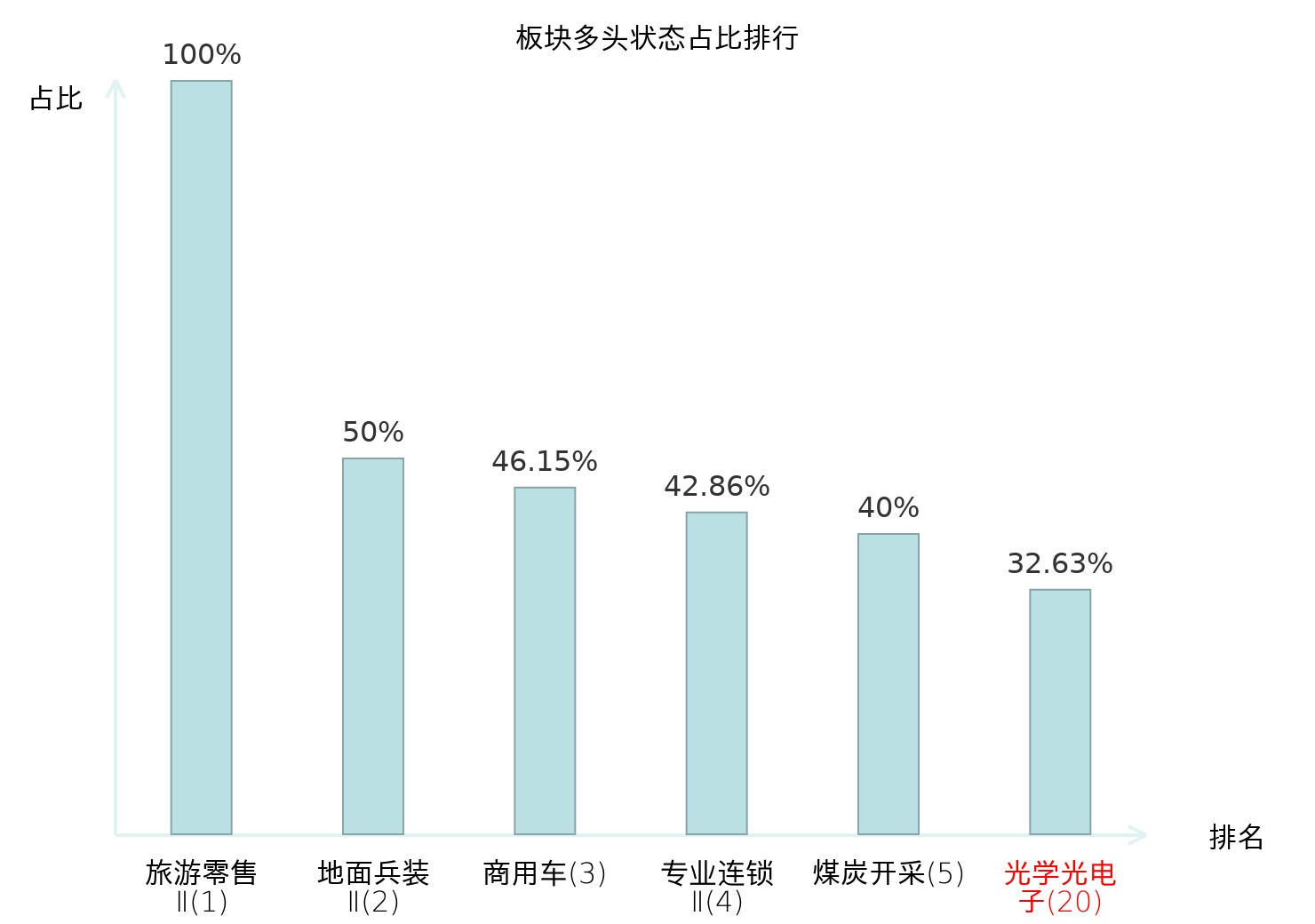 全市场所有行业板块中主力多头状态占比排名中,旅游零售Ⅱ板块位居第一。汽车服务板块名次提升最快,较昨日上升83位。