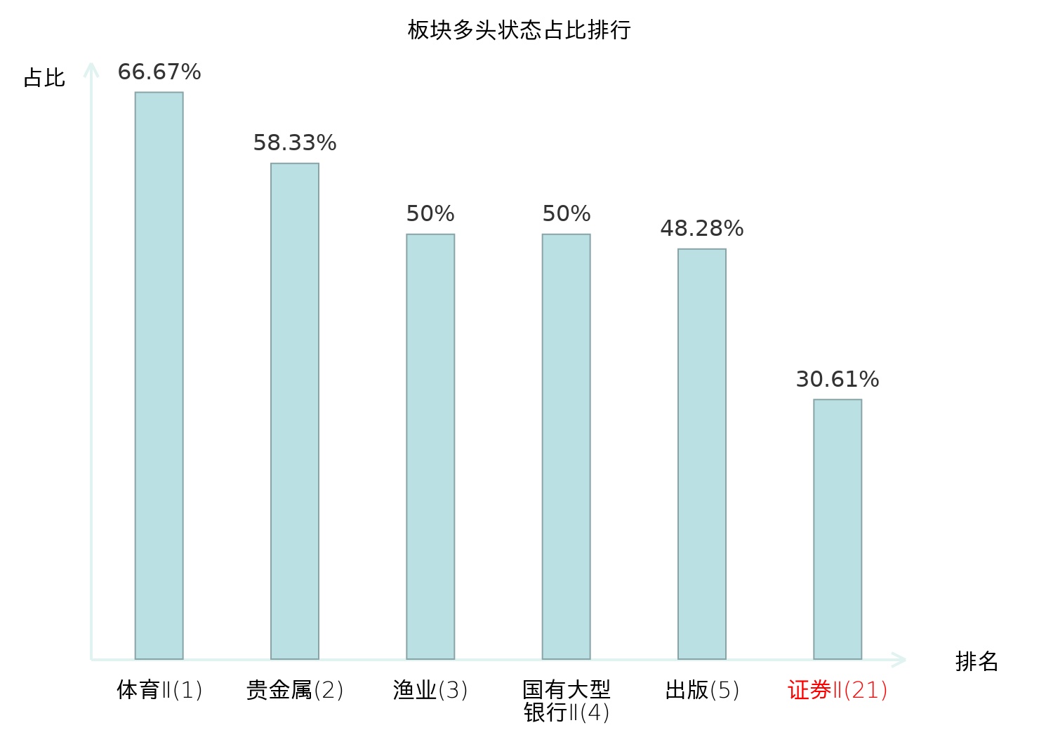 全市场所有行业板块中主力多头状态占比排名中,体育Ⅱ板块位居第一。医药商业板块名次提升最快,较昨日上升69位。