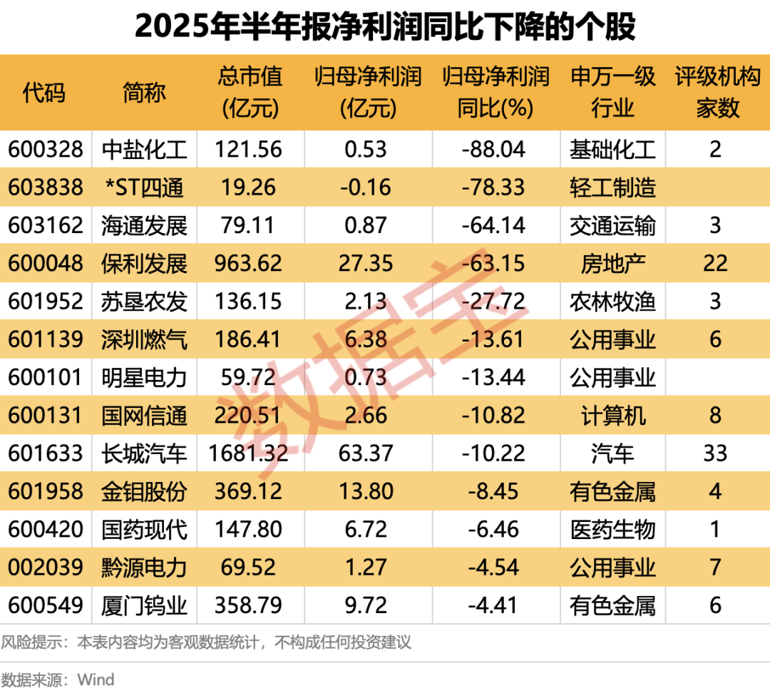 与此同时,13家上市公司2025年净利润同比下滑。其中,中盐化工、*ST四通、海通发展、保利发展4股净利润降幅较大,依次为88.04%、78.33%、64.14%、63.15%。