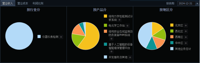 2024年公司结构力学性能测试分析系统、电化学工作站、结构安全在线监测及防务装备PHM系统、基于人工智能的设备智能维保管理平台分别实现营收3.01、0.88、0.72、0.27亿元,同比分别增长35.79%、52.26%、5.12%、13.47%。公司在受益于市场需求增长、国家政策助力辅以研发能力增强和客户关系稳定,延续了营业收入的稳健增长。