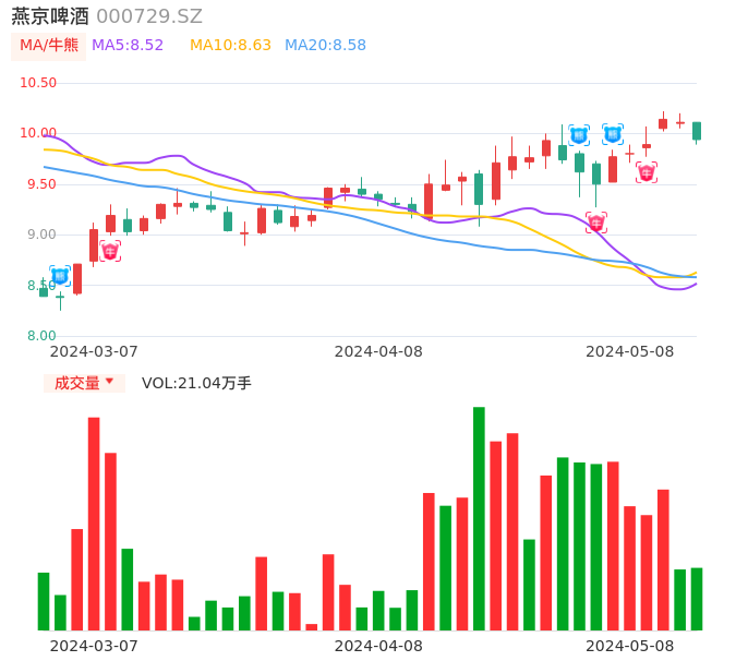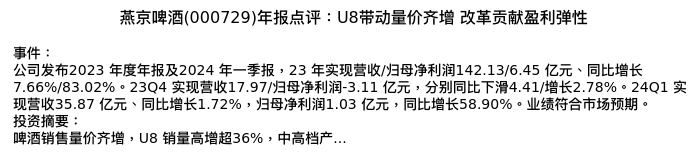值得注意的是:2024年05月申港证券的徐广福分析师,首次发布关于燕京啤酒的研究报告,标题为:燕京啤酒(000729)年报点评:U8带动量价齐增 改革贡献盈利弹性。
