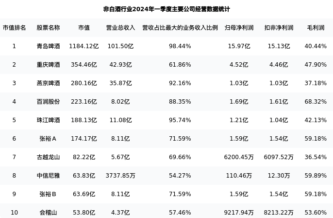 燕京啤酒最新报告期数据为一季度,下表汇总了非白酒行业内市值靠前的公司一季度主要经营数据