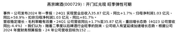 值得注意的是:2024年04月海通证券的颜慧菁分析师,首次发布关于燕京啤酒的研究报告,标题为:燕京啤酒(000729):开门红兑现 旺季弹性可期。