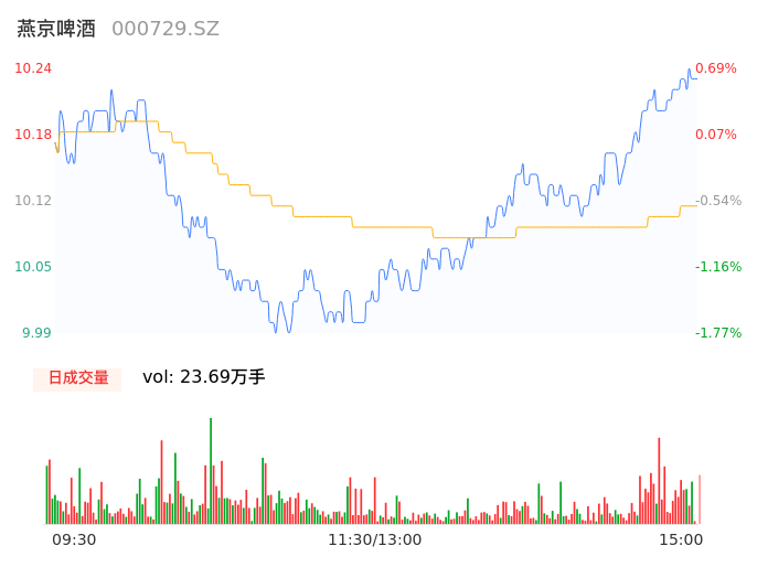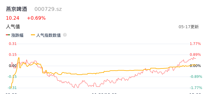 05月17日,燕京啤酒收报10.24,股价涨幅0.69%,成交金额2.40亿元,换手率0.94%。