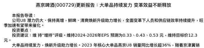 值得注意的是:2024年05月国泰君安的訾猛/陈力宇分析师,首次发布关于燕京啤酒的研究报告,标题为:燕京啤酒(000729)更新报告:大单品持续发力 变革效益不断释放。