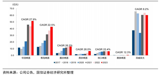 图表6:受益于啤酒行业高端化,2017-2023年啤酒企业归母净利润增长显著