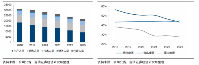 图表9:燕京啤酒员工人数持续精简(左)燕京啤酒生产人员比例持续下降(右)