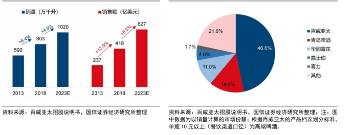 图表5:高端及超高端啤酒市场销量及销售额保持较快增长(左)百威亚太在高端及超高端啤酒市场市占率领先(2018年)(右)