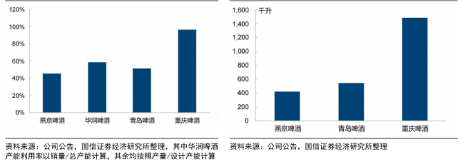 图表8:燕京啤酒2023年产能利用率仅为45.7%(左)燕京啤酒人均产量显著低于可比公司(右)