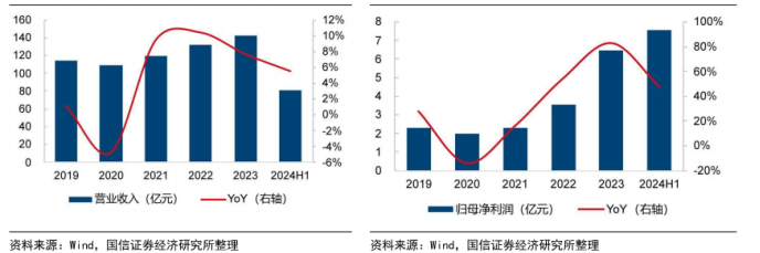 图表4:2019年以来公司营收扭转下降趋势,维持稳健增长(左)2019年以来公司归母净利润显著提升(右)