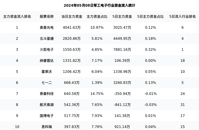从主力资金流向来看,军工电子行业今日主力资金流入50.37亿元,在所有申万二级行业中排名:44/131。