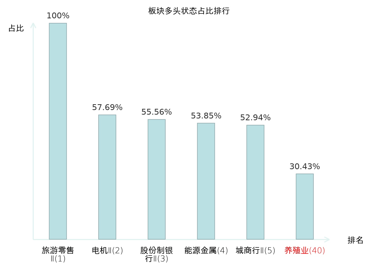 全市场所有行业板块中主力多头状态占比排名中,旅游零售Ⅱ板块位居第一。地面兵装Ⅱ板块名次提升最快,较昨日上升99位。