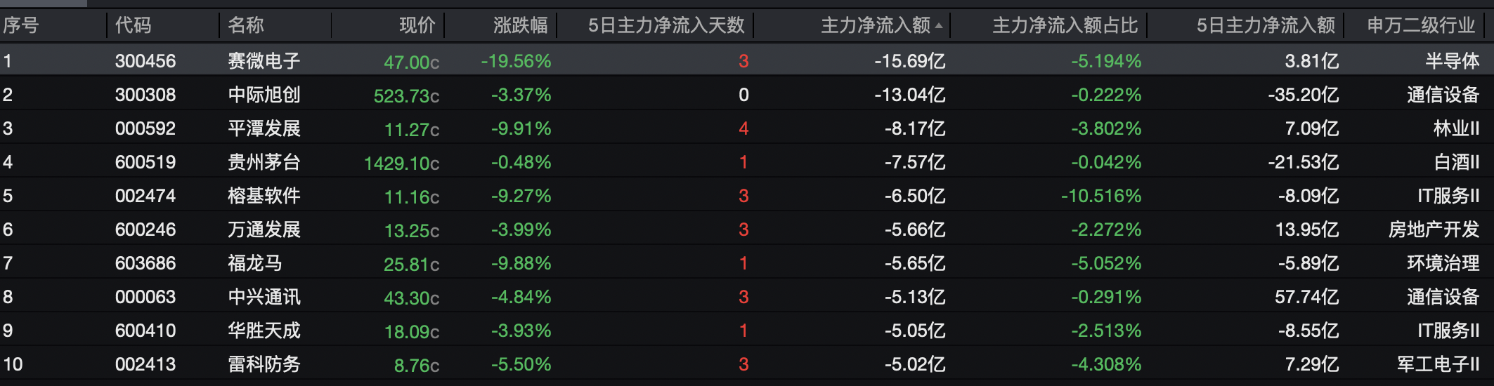 当日主力资金净流出额排名前十个股包括,赛微电子中际旭创平潭发展贵州茅台榕基软件万通发展福龙马中兴通讯华胜天成雷科防务。净流出额均超5亿元,其中,最高为赛微电子,净流出额超15亿元。IT服务、软件开发半导体板块资金净流出额位列前三,分别为50.93亿元、28.92亿元、26.21亿元。