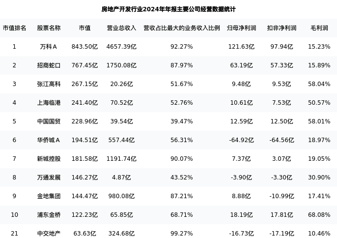 中交地产最新报告期数据为年报,下表汇总了房地产开发行业内市值靠前的公司年报主要经营数据