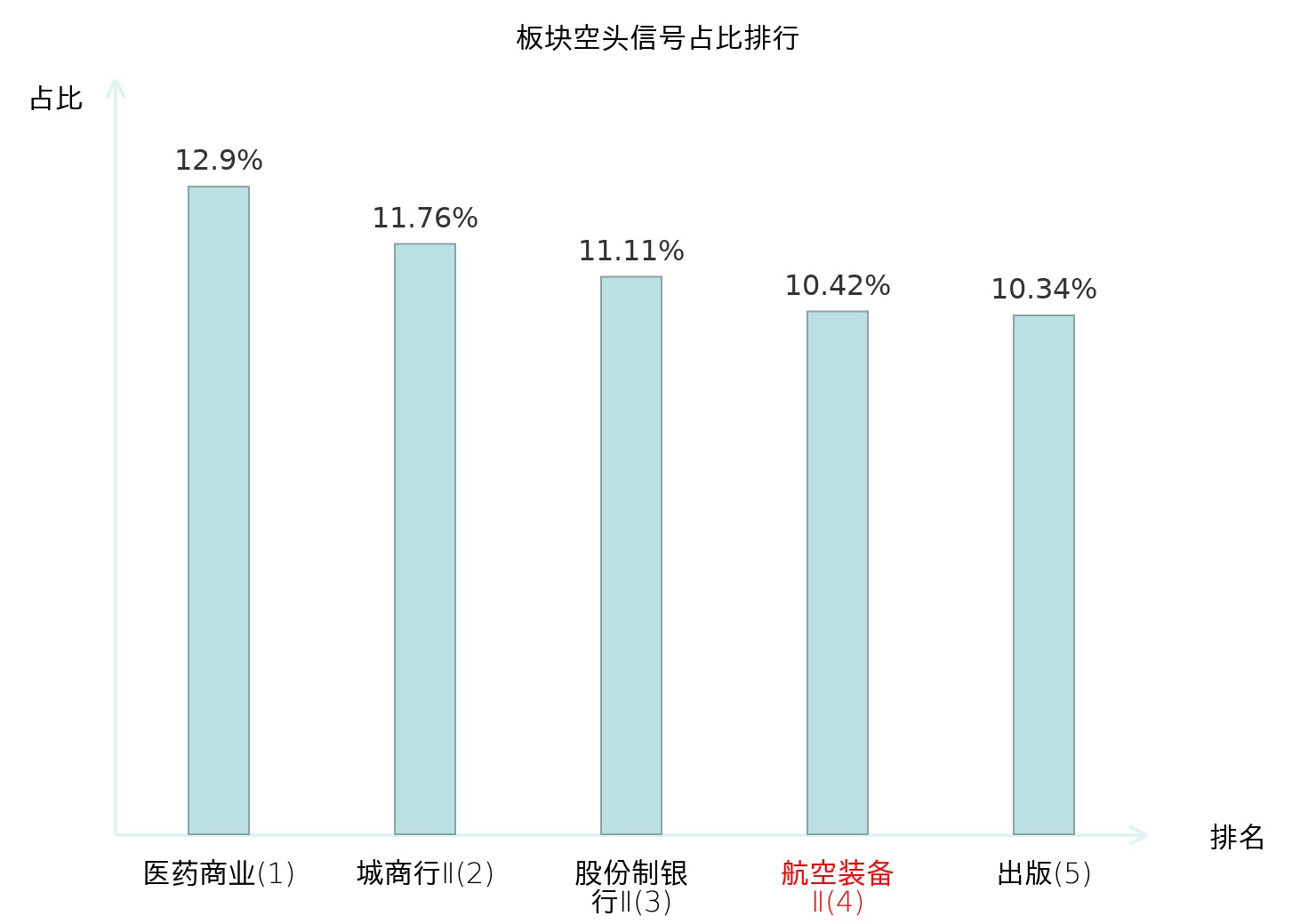 全市场所有行业板块中主力空头信号占比排名中,医药商业板块位居第一。城商行Ⅱ板块名次提升最快,较昨日上升102位。
