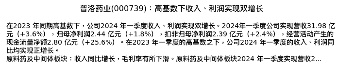 值得注意的是:2024年04月国信证券的彭思宇/张佳博分析师,首次发布关于普洛药业的研究报告,标题为:普洛药业(000739):高基数下收入、利润实现双增长。