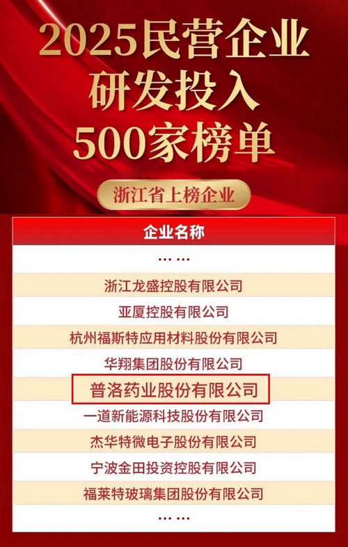 近日,全国工商联重磅发布“2025民营企业研发投入500家”与“2025民营企业发明专利500家”两大权威榜单,凭借在研发领域的持续深耕与卓越表现,普洛药业连续两年入围“民营企业研发投入500强”。