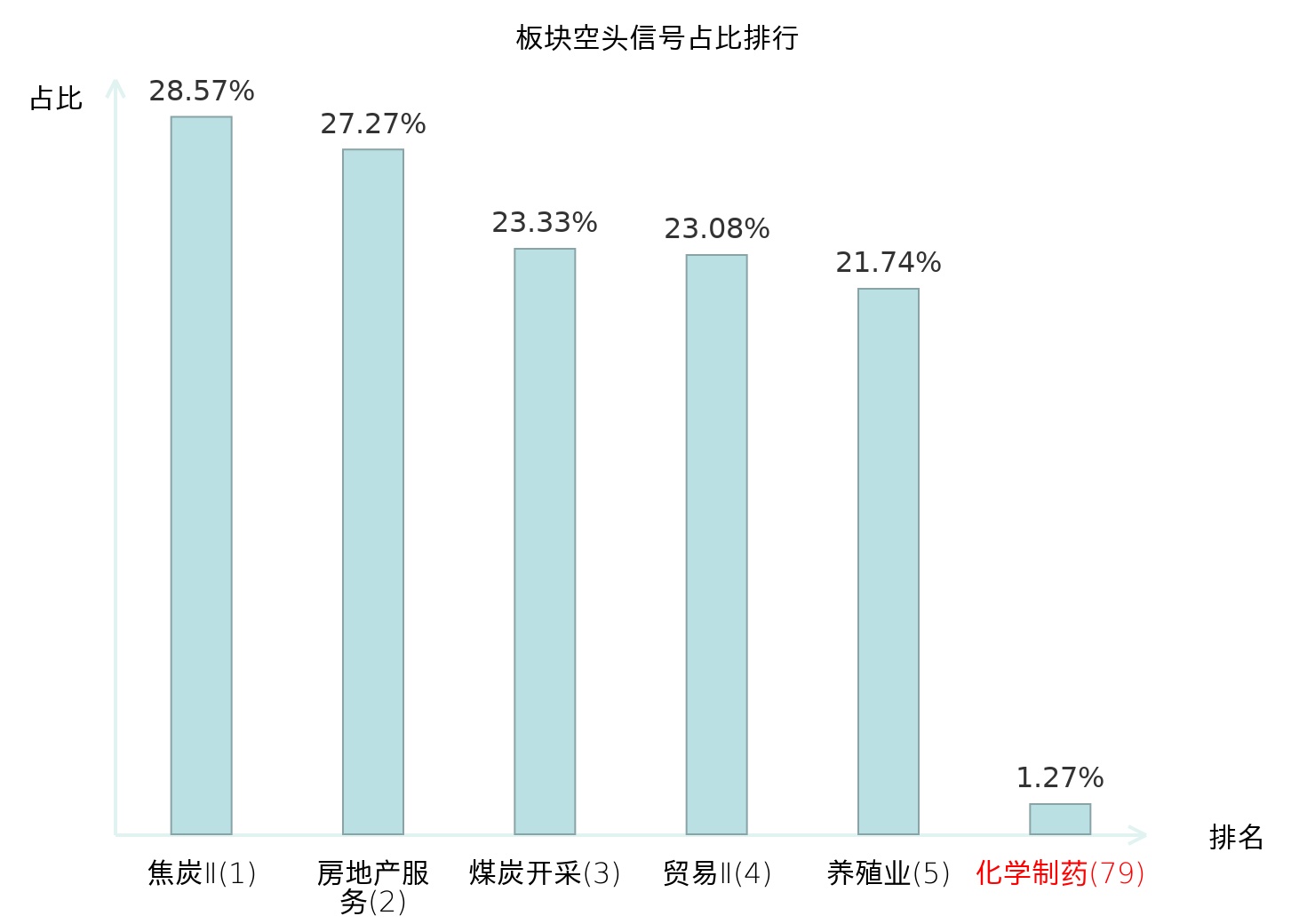 全市场所有行业板块中主力空头信号占比排名中,焦炭Ⅱ板块位居第一。养殖业板块名次提升最快,较昨日上升107位。