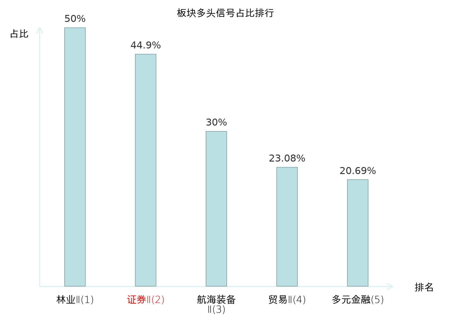 全市场所有行业板块中主力多头信号占比排名中,林业Ⅱ板块位居第一。林业Ⅱ板块名次提升最快,较昨日上升125位。