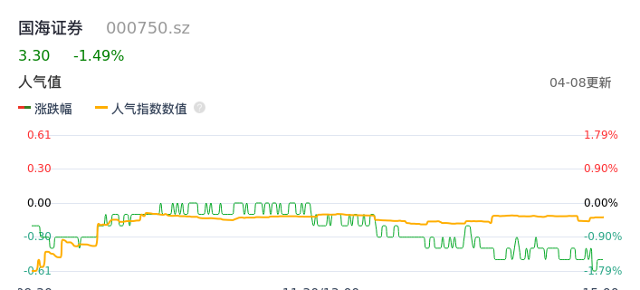 04月08日,国海证券收报3.30,股价涨幅-1.49%,成交金额1.11亿元,换手率0.61%。