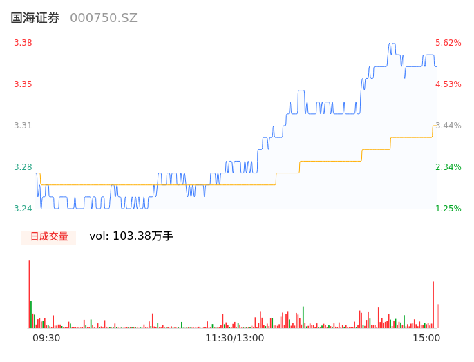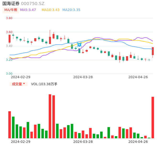 04月26日,国海证券收报3.38,股价涨幅5.62%,成交金额3.42亿元,换手率1.90%。