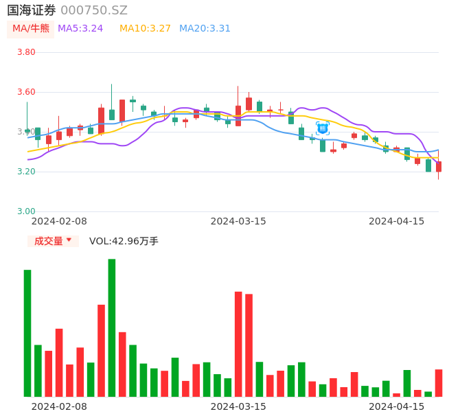 04月15日,国海证券收报3.25,股价涨幅1.56%,成交金额1.39亿元,换手率0.79%。