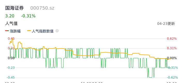 04月23日,国海证券收报3.20,股价涨幅-0.31%,成交金额7175.69万元,换手率0.41%。