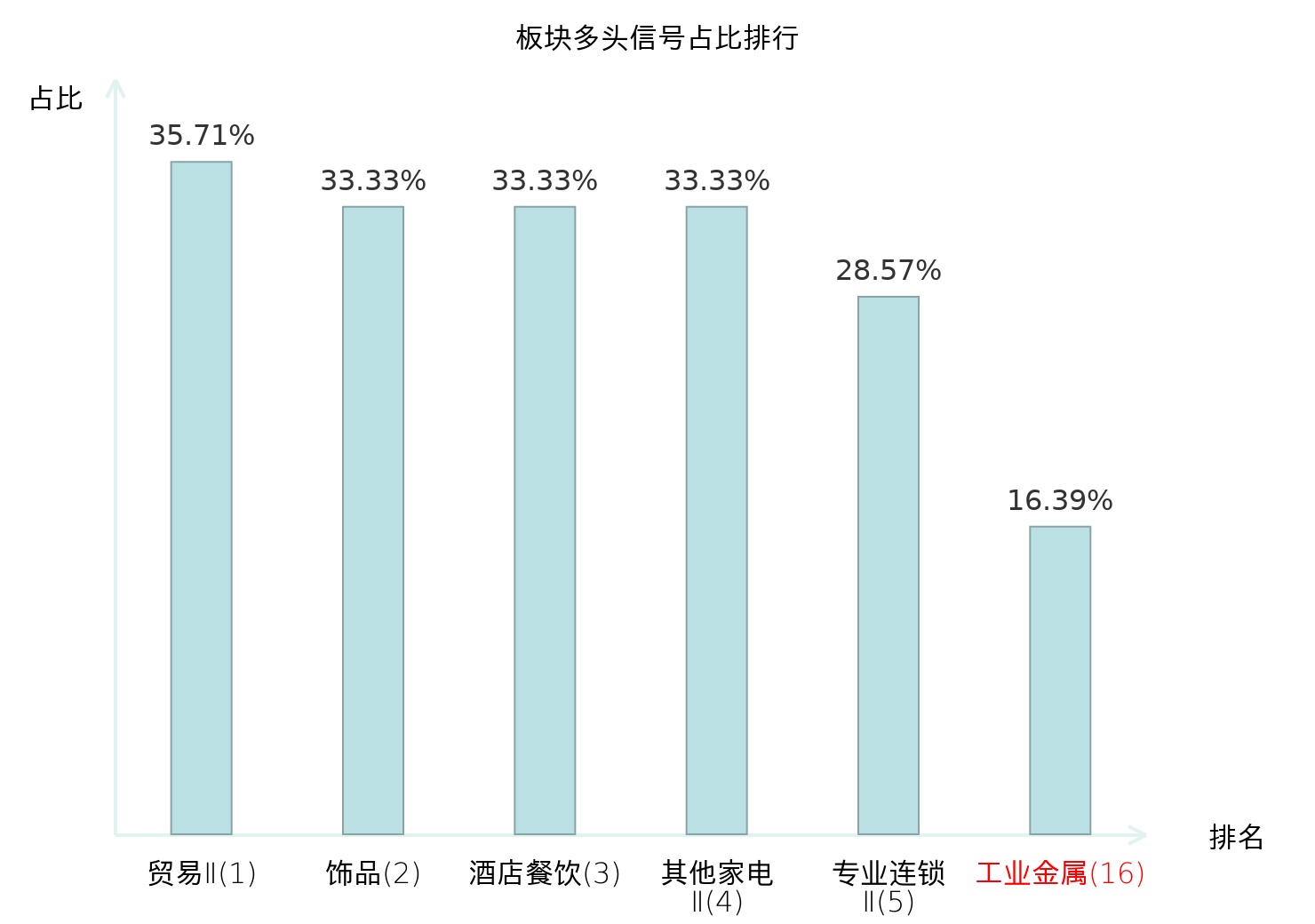 全市场所有行业板块中主力多头信号占比排名中,贸易Ⅱ板块位居第一。其他家电Ⅱ板块名次提升最快,较昨日上升125位。