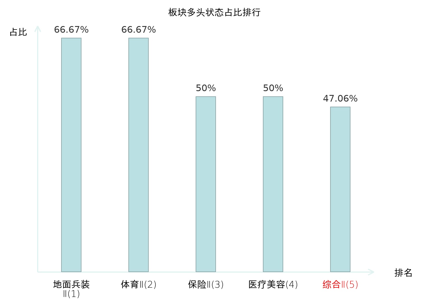 全市场所有行业板块中主力多头状态占比排名中,地面兵装Ⅱ板块位居第一。保险Ⅱ板块名次提升最快,较昨日上升82位。
