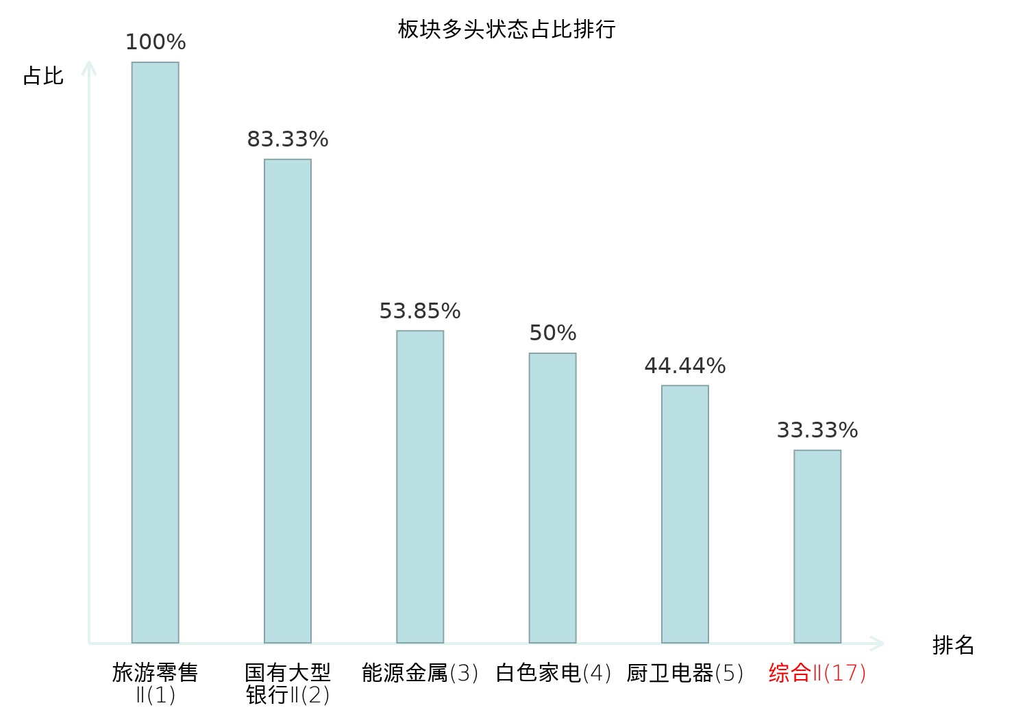 全市场所有行业板块中主力多头状态占比排名中,旅游零售Ⅱ板块位居第一。地面兵装Ⅱ板块名次提升最快,较昨日上升71位。