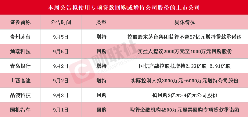 财联社9月7日讯(编辑平方)获得回购增持专项贷款支持的A股上市公司持续扩容。据财联社不完全统计,截至发稿,本周贵州茅台、灿瑞科技、青岛银行、山西高速、晶澳科技、国机汽车在内的6家上市公司披露回购增持再贷款相关情况。具体情况如下图: