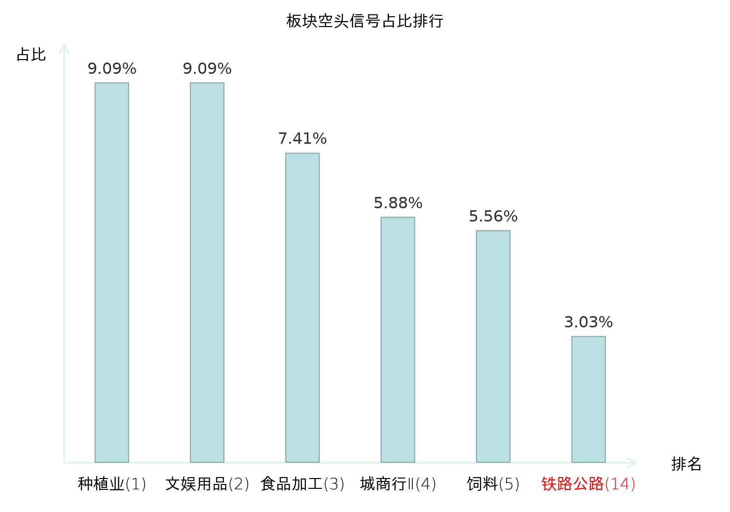 全市场所有行业板块中主力空头信号占比排名中,种植业板块位居第一。文娱用品板块名次提升最快,较昨日上升112位。
