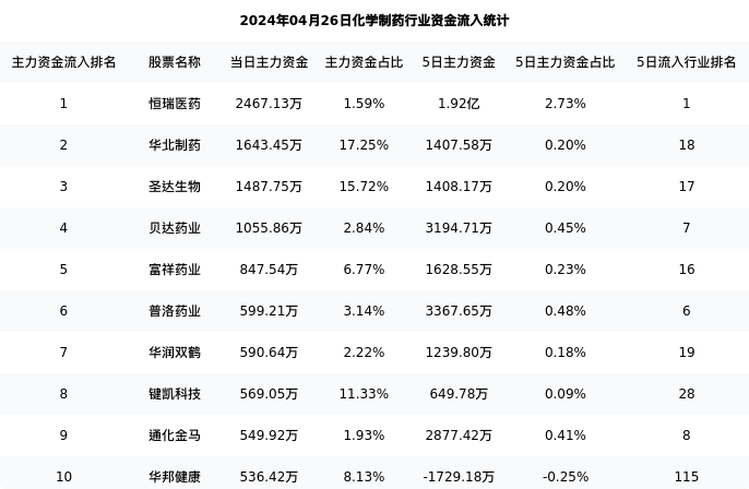 下表为今日行业内流入前10股票的信息